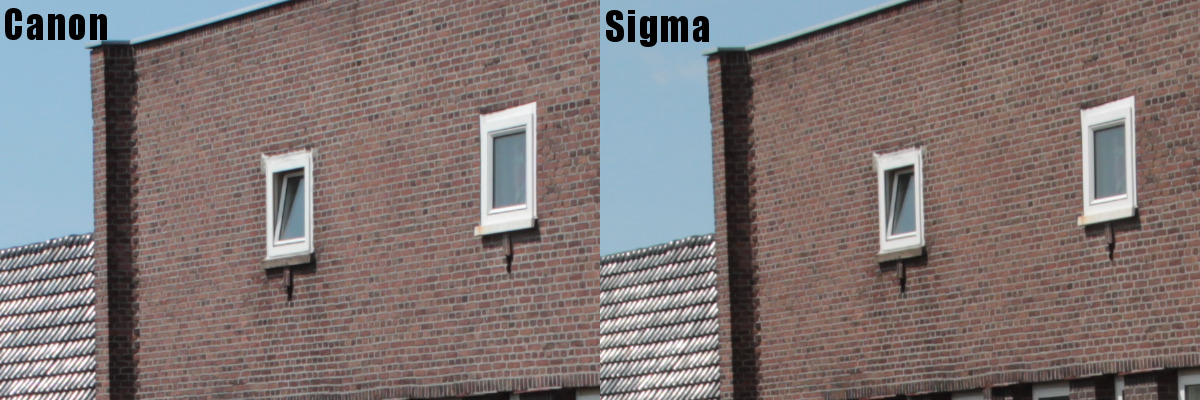 I shot using (cover your children’s eyes) the automatic setting (P). The camera chose F9, 1/320s, ISO 100 for the Canon and the same settings except 1/250s for the Sigma. The DXO Labs comparison of the two lenses suggests that the Canon lets in more light for the same F value, so that might explain the differences in shutter speed. The photos were taken hand-held and focus was acquired using CDAF on the top left white window of the nearest building.